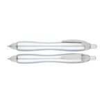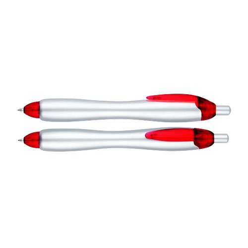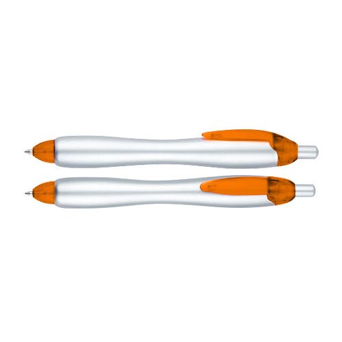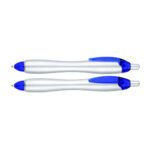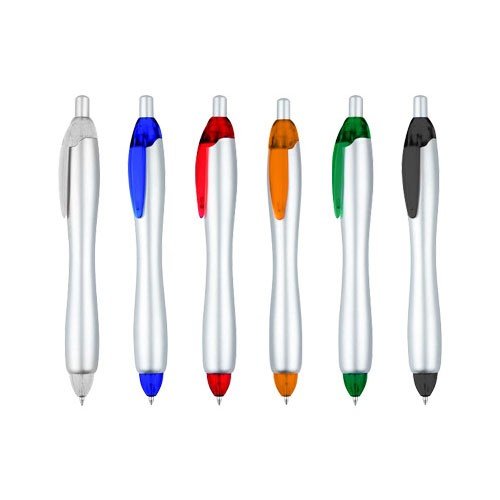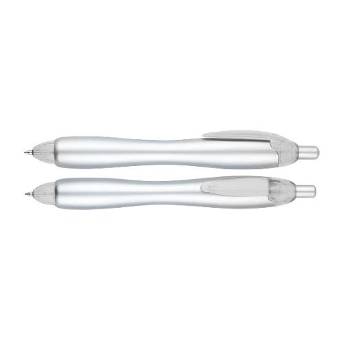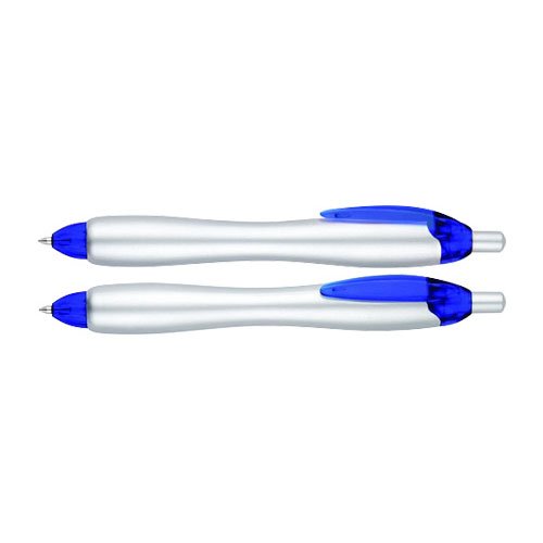 Bolígrafo “Gordito Silver” con cuerpo plateado opaco y terminales de color translúcido. Escritura azul.